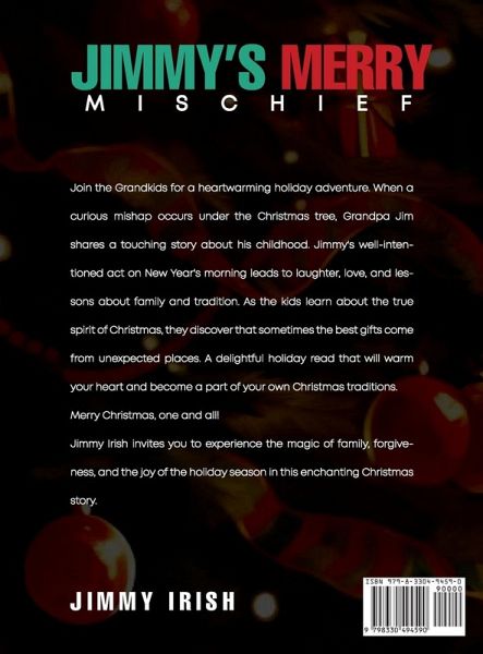 "Jimmy's Merry Mischief" by Jimmy Irish is a heartwarming children's story set during the Christmas holidays. The tale begins with a visit from the grandkids to their grandparents' home in Alaska. When Corley accidentally breaks a few Christmas ornaments, her grandpa is reminded of a childhood memory and decides to share a Christmas story from his past. The story revolves around seven-year-old Jimmy, who, eager to help his mother, decides to take down the family Christmas tree by himself on New Year's Day. His well-intentioned actions lead to an amusing and chaotic series of events, culminating in a valuable lesson about family traditions and communication. Jimmy learns the importance of preserving cherished ornaments, the humor and understanding in his father's response, and the significance of better communication with his parents. Through Grandpa's storytelling, the grandchildren learn about love, understanding, and the true spirit of Christmas. The story concludes with a touching moment of family togetherness and anticipation for the opening of Christmas presents. "Jimmy's Merry Mischief" beautifully captures the essence of family bonds, holiday traditions, and the innocent mischief of childhood.