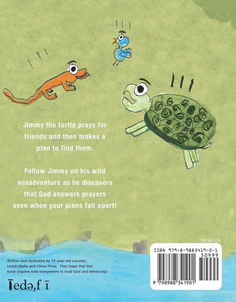 Jimmy the turtle prays for friends and then makes a plan to find them. Follow Jimmy on his wild misadventures as he discovers that God answers prayers even when your plans fall apart! Written and illustrated by 11-year-old cousins, Urijah Stella and Chloe Price, we hope that this book inspires kids everywhere to trust God and dream big! Perfect for children ages 3-5, ages 6-8, toddlers, pre-schoolers, kindergarteners, elementary school, beginning readers.