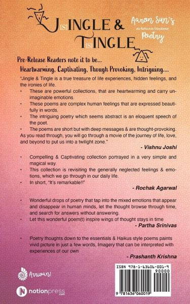 Jingle & Tingle will reflect the emotions of contemporary couples, this collection will enable you to see each other side of you from one another. You may skim through the book and feel rhetoric or sip a hot drink on a cold morning on a comfy seat and look up to retrospect. Jingle & Tingle can also make you nostalgic in a few poems and at times bring more silence to realize Jingle or Tingle of you. This collection aims to find words to unspoken emotions deep in contemporary couples for whom it requires a third voice to speak to see each other. Jingle & Tingle will be your third voice from here. Enjoy the ride with Jingle & Tingle!