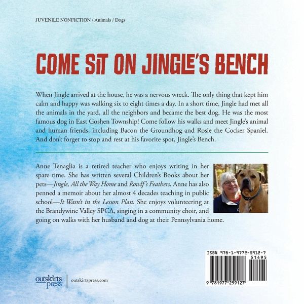 When Jingle arrived at the house, he was a nervous wreck. The only thing that kept him calm and happy was walking six to eight times a day. In a short time, Jingle had met all the animals in the yard, all the neighbors and became the best dog. He was the most famous dog in East Goshen Township! Come follow his walks and meet Jingle's animal and human friends, including Bacon the Groundhog and Rosie the Cocker Spaniel. And don't forget to stop and rest at his favorite spot, Jingle's Bench.