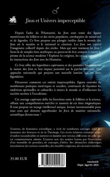 Depuis l'aube de l'Humanité, Les jinn sont restés des figures mystérieuses du folklore et des récits populaires, enveloppées de légendes et de surnaturel. Ce livre propose une plongée inédite dans le monde des Jinn où le mystère et le rationnel se côtoient. Les Jinn ont captivé l'imaginaire collectif depuis des siècles. Mais qui sont vraiment les Jinn ? Sont-ils de simples êtres mythiques ou peuvent-ils être compris à travers le prisme de la science moderne ? Explorez les origines, les caractéristiques et les interactions des Jinn avec les Humains. Ce livre offre des hypothèses captivantes et des postulats fascinants sur la nature des Jinn et leur impact potentiel sur la psyché humaine. Une approche rationnelle qui projette une nouvelle lumière sur ces êtres légendaires. Découvrez comment ces entités imperceptibles, figures centrales de nombreuses pratiques ésotériques et occultes, continuent de façonner les traditions spirituelles et culturelles à travers le monde et d'influencer les sociétés secrètes à l'occultisme. Cet ouvrage captivant défie les frontières entre le folklore et la science, offrant une compréhension enrichie et nuancée de ces êtres énigmatiques. Il vous propose un voyage intellectuel unique, une lecture incontournable pour tous ceux qui désirent appréhender les Jinn de manière rationnelle, scientifique dirons-nous !