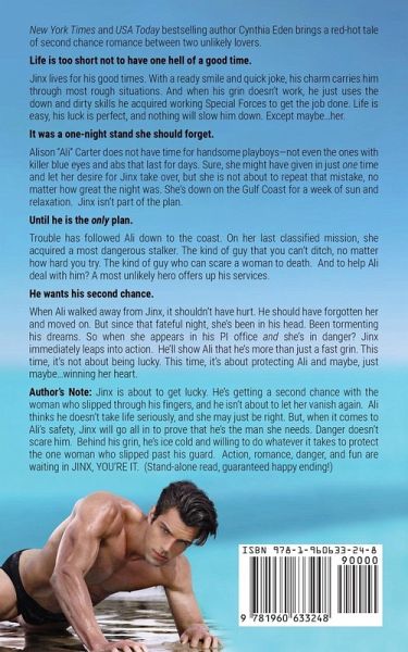 New York Times and USA Today bestselling author Cynthia Eden brings a red-hot tale of second chance romance between two unlikely lovers. Life is too short not to have one hell of a good time. Jinx lives for his good times. With a ready smile and quick joke, his charm carries him through most rough situations. And when his grin doesn't work, he just uses the down and dirty skills he acquired working Special Forces to get the job done. Life is easy, his luck is perfect, and nothing will slow him down. Except maybe...her. It was a one-night stand she should forget. Alison "Ali" Carter does not have time for handsome playboys-not even the ones with killer blue eyes and abs that last for days. Sure, she might have given in just one time and let her desire for Jinx take over, but she is not about to repeat that mistake, no matter how great the night was. She's down on the Gulf Coast for a week of sun and relaxation. Jinx isn't part of the plan. Until he is the only plan. Trouble has followed Ali down to the coast. On her last classified mission, she acquired a most dangerous stalker. The kind of guy that you can't ditch, no matter how hard you try. The kind of guy who can scare a woman to death. And to help Ali deal with him? A most unlikely hero offers up his services. He wants his second chance. When Ali walked away from Jinx, it shouldn't have hurt. He should have forgotten her and moved on. But since that fateful night, she's been in his head. Been tormenting his dreams. So when she appears in his PI office and she's in danger? Jinx immediately leaps into action. He'll show Ali that he's more than just a fast grin. This time, it's not about being lucky. This time, it's about protecting Ali and maybe, just maybe...winning her heart. Author's Note: Jinx is about to get lucky. He's getting a second chance with the woman who slipped through his fingers, and he isn't about to let her vanish again. Ali thinks he doesn't take life seriously, and she may just be right. But, when it comes to Ali's safety, Jinx will go all in to prove that he's the man she needs. Danger doesn't scare him. Behind his grin, he's ice cold and willing to do whatever it takes to protect the one woman who slipped past his guard. Action, romance, danger, and fun are waiting in JINX, YOU'RE IT. (Stand-alone read, guaranteed happy ending!)
