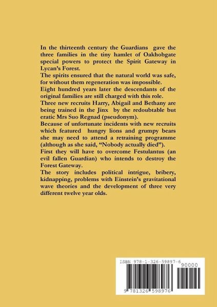 In the thirteenth century the Guardians gave the three families in the tiny hamlet of Oakhobgate special powers to protect the Spirit Gateway in Lycan's Forest. The spirits ensured that the natural world was safe, for without them regeneration was impossible. Eight hundred years later the descendants of the original families are still charged with this role. Three new recruits Harry, Abigail and Bethany are being trained in the Jinx by the redoubtable but eratic Mrs Suo Regnad (pseudonym). Because of unfortunate incidents with new recruits which featured hungry lions and grumpy bears she may need to attend a retraining programme (although as she said, "Nobody actually died"). First they will have to overcome Festulantus (an evil fallen Guardian) who intends to destroy the Forest Gateway. The story includes political intrigue, bribery, kidnapping, problems with Einstein's gravitational wave theories and the development of three very different twelve year olds.