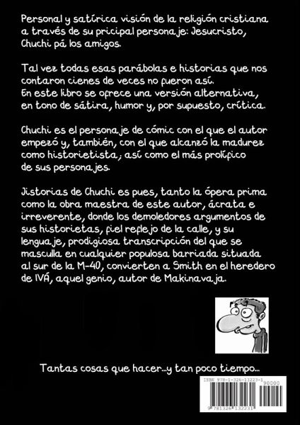 Personal y satírica visión de la religión cristiana a través de su pricipal personaje: Jesucristo, Chuchi pá los amigos. Tal vez todas esas parábolas e historias que nos contaron cienes de veces no fueron así. En este libro se ofrece una versión alternativa, en tono de sátira, humor y, por supuesto, crítica. Chuchi es el personaje de cómic con el que el autor empezó y, también, con el que alcanzó la madurez como historietista; así como el más prolífico de sus personajes. Jistorias de Chuchi es pues, tanto la ópera prima como la obra maestra de este autor, ácrata e irreverente, donde los demoledores argumentos de sus historietas, fiel reflejo de la calle, y su lenguaje, prodigiosa transcripción del que se masculla en cualquier populosa barriada situada al sur de la M-40, convierten a Smith en el heredero de IVÁ, aquel genio, autor de Makinavaja.