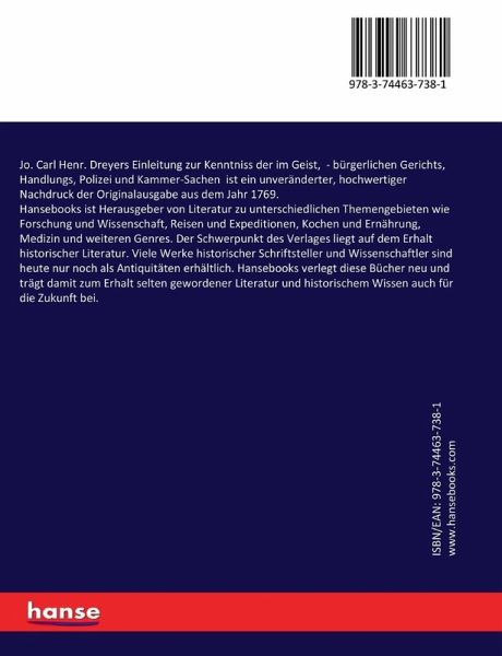 Jo. Carl Henr. Dreyers Einleitung zur Kenntniss der im Geist, - bürgerlichen Gerichts, Handlungs, Polizei und Kammer-Sachen ist ein unveränderter, hochwertiger Nachdruck der Originalausgabe aus dem Jahr 1769.