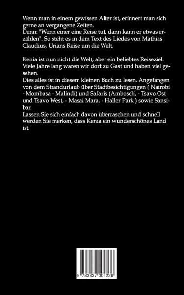 Wenn man in einem gewissen Alter ist, erinnert man sich gerne an vergangene Zeiten.Denn: "Wenn einer eine Reise tut, dann kann er etwas erzählen". So steht es in dem Text des Liedes von Matthias Claudius, Urians Reise um die Welt.Kenia ist nun nicht die Welt, aber ein beliebtes Reiseziel. Viele Jahre lang waren wir dort zu Gast und haben viel gesehen.Dies alles ist in diesem kleinen Buch zu lesen. Angefangen von dem Strandurlaub über Stadtbesichtigungen (Nairobi - Mombasa - Malindi) und Safaris (Amboseli, - Tsavo Ost und Tsavo West, - Masai Mara, - Haller Park) sowie Sansibar.Lassen Sie sich einfach davon überraschen und schnell werden Sie merken, dass Kenia ein wunderschönes Land ist.