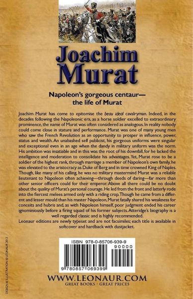 Napoleon's gorgeous centaur-the life of Murat Joachim Murat has come to epitomise the beau ideal cavalryman. Indeed, in the decades following the Napoleonic era, as a horse soldier excelled to extraordinary prominence, the name of Murat was often considered as analogous. In reality nobody could come close in stature and performance. Murat was one of many young men who saw the French Revolution as an opportunity to prosper in influence, power, status and wealth. An unabashed self publicist, his gorgeous uniforms were singular and exceptional even in an age when the dandy in military uniform was the norm. His ambition was insatiable and in this was the root of his downfall, for he lacked the intelligence and moderation to consolidate his advantages. Yet, Murat rose to be a soldier of the highest rank, through marriage a member of Napoleon's own family, he was elevated to the aristocracy as Duke of Berg and in time crowned King of Naples. Though, like many of his calling, he was no military mastermind Murat was a reliable lieutenant to Napoleon often achieving-through deeds of daring-far more than other senior officers could for their emperor. Above all there could be no doubt about the quality of Murat's personal courage. He led from the front and latterly rode into the fiercest melees armed only with a riding crop. Though he came from a different and lesser mould than his master Napoleon, Murat fatally shared his weakness for conceits and hubris and, as with Napoleon himself, poor judgment ended his career ignominiously before a firing squad of his former subjects. Atteridge's biography is a well regarded classic and is highly recommended. Leonaur editions are newly typeset and are not facsimiles; each title is available in softcover and hardback with dustjacket.