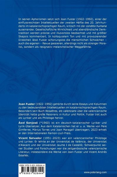 In seinen Aphorismen setzt sich Joan Fuster (1922-1992), einer der einflussreichsten Intellektuellen der zweiten Hälfte des 20. Jahrhunderts im katalanischsprachigen Raum, kritisch mit der conditio humana auseinander. Gesellschaftliche Wirklichkeit und abendländische Denktradition werden präzise und illusionslos beobachtet und mit größter Skepsis kommentiert. In kolloquialem Ton und mit provozierender Direktheit lässt Fuster schonungslos die menschlichen Schwächen - auch die eigenen - Revue passieren, allerdings nicht als strenger Moralist, sondern als resignativ-melancholischer Weggefährte.