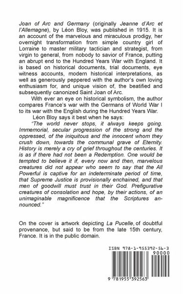 Joan of Arc and Germany (originally Jeanne d¿Arc et l¿Allemagne), by Léon Bloy, was published in 1915. It is an account of the marvelous and miraculous prodigy, her overnight transformation from simple country girl of Lorraine to master military tactician and strategist, from virgin to general, from nobody to savior of France, putting an abrupt end to the Hundred Years War with England. It is based on historical documents, trial documents, eye witness accounts, modern historical interpretations, as well as generously peppered with the author¿s own loving enthusiasm for, and unique vision of, the beatified and subsequently canonized Saint Joan of Arc. With ever an eye on historical symbolism, the author compares France¿s war with the Germans of World War I to its war with the English during the Hundred Years War. Léon Bloy says it best when he says: "The world never stops, it always keeps going. Immemorial, secular progression of the strong and the oppressed, of the iniquitous and the innocent whom they crush down, towards the communal grave of Eternity. History is merely a cry of grief throughout the centuries. It is as if there had not been a Redemption. One would be tempted to believe it if, every now and then, marvelous creatures did not appear who seem to say that the All Powerful is captive for an indeterminate period of time, that Supreme Justice is provisionally enchained, and that men of goodwill must trust in their God. Prefigurative creatures of consolation and hope, by their actions, of an unimaginable magnificence that the Scriptures announced."
