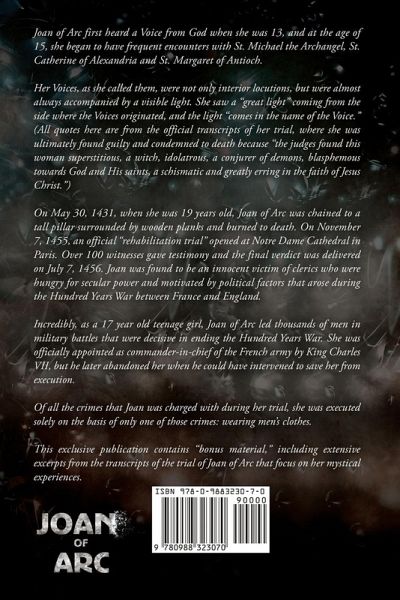 Joan of Arc's fascinating life ended when she was 19 years old-burned at the stake after leading thousands of men in military battles that were decisive in ending the Hundred Years War. She was officially appointed as commander-in-chief of the French army by King Charles VII, but he later abandoned her when he could have intervened to save her from execution. In 1431, from January 9 to May 30, Joan was put on trial because "the judges found this woman superstitious, a witch, idolatrous, a conjurer of demons, blasphemous towards God and His saints, a schismatic and greatly erring in the faith of Jesus Christ." The transcripts of her trial were written by Guillaume Manchon, a notary, who produced the original documentation with oversight and assistance from two other notaries, Guillaume Colles and Nicolas Taquel. Those transcripts were written in Medieval/Middle French, and after the trial Manchon and one of the judges, Thomas de Courcelles, translated the Middle French into Latin and five handwritten copies were made. The first unabridged translations of those original Latin transcripts were published in modern French in 1841 by Jules Etienne Joseph Quicherat and in English in 1932 by W.P. Barrett. This publication-Joan of Arc: Her Trial Transcripts-offers a shorter, abridged version that was edited solely for readability in modern English. Some of the most controversial issues surrounding Joan of Arc involve claims she was a lesbian or perhaps even a transgender person. Historians have criticized writers such as Vita Sackville-West (1892-1962) for making such claims. Historians correctly noted that bedding was relatively scarce in the 15th century, and two women sleeping in the same bed cannot be construed as evidence of sexual intimacy. Historians also addressed the transgender claims by stating the need for Joan to protect herself from sexual assault in prison as well as the need to dress in men's clothes during military operations. While both of those arguments are true, they neglect to address the evidence in its entirety, which is documented in Joan of Arc's trial transcripts. The Epilogue in this book by Emilia P. Sanguinetti addresses the theological debate occurring today within the Catholic Church regarding its relationship with the LGBT community. Theology to support Catholic gay marriage is also addressed based on the 2005 papal encyclical "God is Love," which has an overarching theme that eros (erotic love) is perfected by agape (self-sacrificial love). A quiet revolution is occurring today in the Catholic Church. Gay, lesbian, bisexual and transgender Catholics are beginning to claim their rightful place in the Church. Also, with the publication of the 2016 apostolic letter, "Amoris Laetitia," many bishops, priests and laypeople claim they have the doctrinal foundation for allowing divorced and remarried Catholics to receive Holy Communion. Both of these topics are fully covered in the Epilogue, as well as theories about the origin of Joan's "voices" (the mysterious interior locutions that guided her behavior). Joan clearly and forcefully said her "voices" commanded her to wear men's clothes, and that she could not wear women's clothes under any circumstances-even when wearing women's clothes was a requirement for her to receive Holy Communion.
