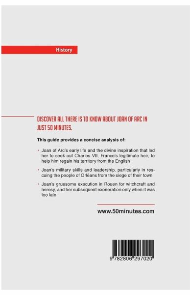 Keen to learn but short on time? Get to grips with the life of Joan of Arc in next to no time with this concise guide. 50Minutes.com provides a clear and engaging analysis of Joan of Arc. As the Hundred Years¿ War raged on, and the possibility of the French reclaiming their territory from the English occupation seemed ever slimmer, one unlikely young woman would set out on a divine mission to restore the French monarchy and free the population from tyranny. However, Joan of Arc¿s military skill and courage would not go unpunished, and she was brutally burned at the stake for witchcraft after being captured by the English. She is now revered as a saint in the Roman Catholic Church. In just 50 minutes you will: ¿ Learn about Joan of Arc¿s early life and the divine inspiration that led her to seek out Charles VII, France¿s legitimate heir, to help him regain his territory from the English ¿ Explore Joan¿s military skills and leadership, particularly in rescuing the people of Orléans from the siege of their town ¿ Discover Joan¿s gruesome execution in Rouen for witchcraft and heresy, and her subsequent exoneration only when it was too late ABOUT 50MINUTES.COM History & Culture 50MINUTES.COM will enable you to quickly understand the main events, people, conflicts and discoveries from world history that have shaped the world we live in today. Our publications present the key information on a wide variety of topics in a quick and accessible way that is guaranteed to save you time on your journey of discovery.