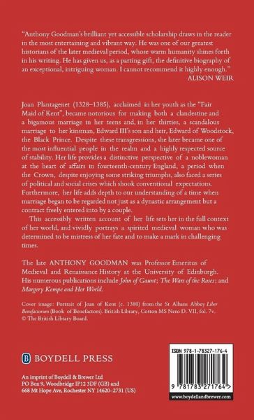 A new account of the life and turbulent times of Joan, the wife of the Black Prince and mother of Richard II. Anthony Goodman's brilliant yet accessible scholarship draws in the reader in the most entertaining and vibrant way. He was one of our greatest historians of the later medieval period, whose warm humanity shines forth in his writing. He has given us, as a parting gift, the definitive biography of an exceptional, intriguing woman. I cannot recommend it highly enough. ALISON WEIR Joan Plantagenet (1328-1385), acclaimed in her youth as the "FairMaid of Kent", became notorious for making both a clandestine and a bigamous marriage in her teens and, in her thirties, a scandalous marriage to her kinsman, Edward III's son and heir, Edward of Woodstock, the Black Prince. Despite these transgressions, she later became one of the most influential people in the realm and a highly respected source of stability. Her life provides a distinctive perspective of a noblewoman at the heart of affairs in fourteenth-century England, a period when the Crown, despite enjoying some striking triumphs, also faced a series of political and social crises which shook conventional expectations. Furthermore, her life adds depth to our understanding of a time when marriage began to be regarded not just as a dynastic arrangement but a contract freely entered into by a couple. This accessibly written account of her life sets her in the full context of her world, and vividlyportrays a spirited medieval woman who was determined to be mistress of her fate and to make a mark in challenging times. The late Anthony Goodman was Professor Emeritus of Medieval and Renaissance History at the University of Edinburgh. His numerous publications include John of Gaunt; The Wars of the Roses; and Margery Kempe and Her World.