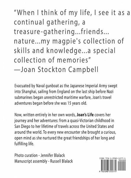 Evacuated by Naval gunboat as the Japanese Imperial Army swept into Shanghai, sailing from England on the last ship before Nazi submarines began unrestricted maritime warfare, Joan's travel adventures began before she was 15 years old. In her own words Joan covers her journey and adventures from her quasi-Victorian childhood in San Diego through her lifetime of travels across the United States and around the world. Enjoy the curious, open mind she brings to every strange new encounter as she nurtures the great friendships of a life long and full, becoming her own woman in her own world.