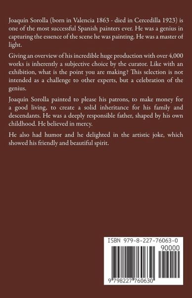 Joaquín Sorolla (born in Valencia 1863 - died in Cercedilla 1923) is one of the most successful Spanish painters ever. He was a genius in capturing the essence of the scene he was painting. He was a master of light. Giving an overview of his incredible huge production with over 4,000 works is inherently a subjective choice by the curator. Like with an exhibition, what is the point you are making? This selection is not intended as a challenge to other experts, but a celebration of the genius. Joaquín Sorolla painted to please his patrons, to make money for a good living, to create a solid inheritance for his family and descendants. He was a deeply responsible father, shaped by his own childhood. He believed in mercy. He also had humor and he delighted in the artistic joke, which showed his friendly and beautiful spirit.