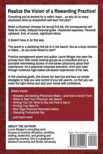 Residents, fellows, and other physician job seekers: Realize your vision of a rewarding practice! Everything you've worked for is within reach... so why do so many physicians wind up dissatisfied with their first jobs? When a physician chooses the wrong first job, the consequences will likely be costly: Delayed financial goals. Unplanned expenses. Personal upheaval. And, of course, significant stress. It doesn't have to be that way. The secret to a satisfying first job is in the search. But as a busy resident or fellow... do you know where to start? Practice management expert and author Laurie Morgan has seen the process from both inside medical groups as a consultant and as a journalist interviewing dozens of mid-career physicians about their experiences. As a seasoned corporate executive, she's also been through numerous high-stakes job-search experiences of her own. In this practical guide, she shares her best tips and lays out simple strategies to help you take control of your job search-so that you can make the right choice and start your career with confidence.