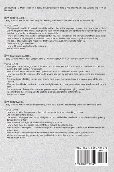Job Hunting - 3 Manuscripts in 1 Book, Including: How to Find a Job, How to Change Careers and How to Network. 1) HOW TO FIND A JOB: 7 Easy Steps to Master Job Searching, Job Hunting, Job Offer Application Planner & Job Seeking. YOU'LL LEARN: · What you will need to do to understand the skillsets that will help you get a career and how to market them. · Everything you need to know about getting your resume prepared and updated before you begin your job search to ensure that applying is as smooth as possible. · How to choose the right kinds of companies that you want to work for and why you want those over others. · How to begin your job application lists to keep your application process as organized as possible. · The basics of networking to make sure that you have enough references to help you. · Choosing the right references. · How to fill in job applications the right way. · And so much more! 2) HOW TO CHANGE CAREERS: 7 Easy Steps to Master Your Career Change, Switching Jobs, Career Coaching & New Career Planning. YOU'LL LEARN:What your current strengths and skills are so you know where to focus your efforts and how you can start making the right changes for yourself. How to consider your current career options and what you will need to do to get to them. How you can start to experience the world around you just by spending time volunteering and shadowing others. The importance of taking classes from time to time to get more experience and expose yourself to new subjects. Why you should take the time to choose the right career and how you can figure out which one will be just right. The importance of credentials and what you can expect when you are trying to meet them. Tips and tricks that will help you to apply to a job in a completely different field. And so much more! 3) HOW TO NETWORK: 7 Easy Steps to Master Personal Networking, Small Talk, Business Networking Events & Networking Skills. YOU'LL LEARN:How to start identifying contacts that could be useful for your networking process. Choosing contacts to pursue. Learning to defeat your own personal shyness so you will be able to relate to others better and stop being defeated by your fear. How to master the right social skills that will help you thrive. How to help the other person to benefit them to build the relationship. Ways that you can begin to stand out in ways that are meaningful so your connections will remember and respect you. Ways that you can develop your relationships naturally and effectively to better communicate. Methods of maintaining generosity and gratitude to ensure that you can connect better. And so much more!
