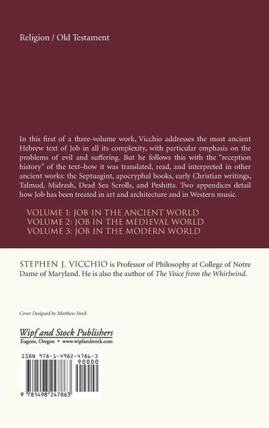 In this first of a three-volume work, Vicchio addresses the most ancient Hebrew text of Job in all its complexity, with particular emphasis on the problems of evil and suffering. But he follows this with the ""reception history"" of the text--how it was translated, read, and interpreted in other ancient works: the Septuagint, apocryphal books, early Christian writings, Talmud, Midrash, Dead Sea Scrolls, and Peshitta. Two appendices detail how Job has been treated in art and architecture and in Western music. Volume 1: Job in the Ancient World Volume 2: Job in the Medieval World Volume 3: Job in the Modern World