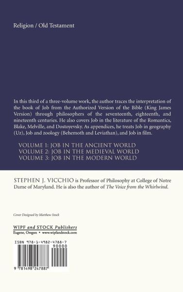 In this third of a three-volume work, the author traces the interpretation of the book of Job from the Authorized Version of the Bible (King James Version) through philosophers of the seventeenth, eighteenth, and nineteenth centuries. He also covers Job in the literature of the Romantics, Blake, Melville, and Dostoyevsky. As appendices, he treats Job in Geography (Uz), Job and Zoology (Behemoth and Leviathan), and Job in Film. Volume 1: Job in the Ancient World Volume 2: Job in the Medieval World Volume 3: Job in the Modern World