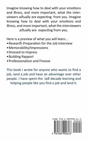 Imagine knowing how to deal with your emotions and stress, and more important, what the interviewers actually are expecting from you. Imagine knowing how to deal with your emotions and stress, and more important, what the interviewers actually are expecting from you. Here is a preview of what you will learn... Research Preparation for the Job Interview Memorability/Impressions Dressed to Impress Building Rapport Professionalism and Finesse This book I wrote for anyone who wants to find a job, land a job and have an advantage over other people. I have spent the last decade learning and helping people like you find a job and land it.