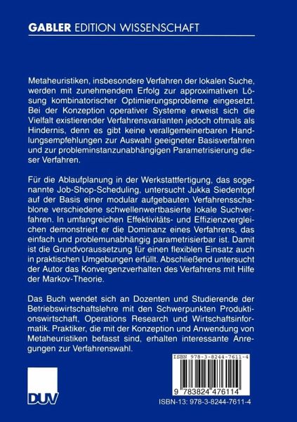 Für die Ablaufplanung in der Werkstattfertigung, das sogenannte Job-Shop-Scheduling, untersucht Jukka Siedentopf auf der Basis einer modular aufgebauten Verfahrensschablone verschiedene schwellenwertbasierte lokale Suchverfahren. In umfangreichen Effektivitäts- und Effizienzvergleichen demonstriert er die Dominanz eines Verfahrens, das einfach und problemunabhängig parametrisierbar ist. Damit ist die Grundvoraussetzung für einen flexiblen Einsatz auch in praktischen Umgebungen erfüllt. Abschließend untersucht der Autor das Konvergenzverhalten des Verfahrens mit Hilfe der Markov-Theorie.