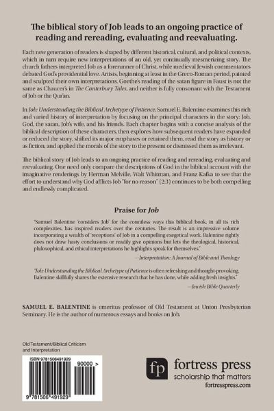 Each new generation of readers is shaped by different historical, cultural, and political contexts, which in turn require new interpretations of an old, yet continually mesmerizing story. The church fathers interpreted Job as a forerunner of Christ, while medieval Jewish commentators debated God's providential love. Artists, beginning at least in the Greco-Roman period, painted and sculpted their own interpretations. Goethe's reading of the satan figure in Faust is not the same as Chaucer's in The Canterbury Tales , and neither is fully consonant with the Testament of Job or the Qur'an. In Job: Understanding the Biblical Archetype of Patience, Samuel E. Balentine examines this rich and varied history of interpretation by focusing on the principal characters in the story: Job, God, the satan, Job's wife, and his friends. Each chapter begins with a concise analysis of the biblical description of these characters, then explores how subsequent readers have expanded or reduced the story, shifted its major emphases or retained them, read the story as history or as fiction, and applied the morals of the story to the present or dismissed them as irrelevant. The biblical story of Job leads to an ongoing practice of reading and rereading, evaluating and reevaluating. One need only compare the descriptions of God in the biblical account with the imaginative renderings by Herman Melville, Walt Whitman, and Franz Kafka to see that the effort to understand why God afflicts Job "for no reason" (2:3) continues to be both compelling and endlessly complicated.