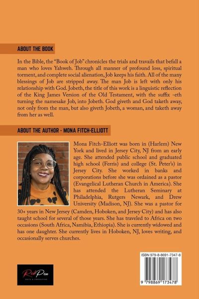 In the Bible, the "Book of Job" chronicles the trials and travails that befall a man who loves Yahweh. Through all manner of profound loss, spiritual torment, and complete social alienation, Job keeps his faith. All of the many blessings of Job are stripped away. The man Job is left with only his relationship with God. Jobeth, the title of this work is a linguistic reflection of the King James Version of the Old Testament, with the suffix -eth turning the namesake Job, into Jobeth. God giveth and God taketh away, not only from the man, but also giveth Jobeth, a woman, and taketh away from her as well. Mona Fitch-Elliott was born in (Harlem) New York and lived in Jersey City, NJ from an early age. She attend public school and graduated high school (Ferris) and college (St. Peter's) in Jersey City. She worked in banks and corporations before she was ordained as a pastor (Evangelical Lutheran Church in America). She has attended the Lutheran Seminary at Philadelphia, Rutgers Newark, and Drew University (Madison, NJ). She was a pastor for 30+ years in New Jersey (Camden, Hoboken, and Jersey City) and has also taught school for several of those years. She has traveled to Africa on two occasions (South Africa, Namibia, Ethiopia). She is currently widowed and has one daughter. She currently lives in Hoboken, NJ, loves writing, and occasionally serves churches.