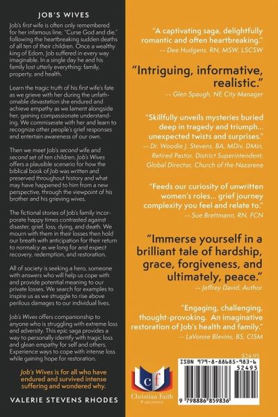 Job's Wives is for all who have endured and survived intense suffering and wondered why. The fictional stories of Job's distinctive family incorporate happy times demonstrating their love for each other contrasted against disaster, grief, loss, dying, and death. We mourn with them in their losses but hold our breath when anticipating their return to normalcy as we long for and expect recovery, redemption, and restoration. Once a wealthy king of Edom, Job suffered in every way imaginable. He lost everything, including his health. He and his first wife faced the immeasurable challenge of the heartbreaking sudden deaths of their ten children. Learn the tragic truth of her fate. We grieve for her when we contemplate her unfathomable dilemma and achieve empathy as we lament alongside her, gaining compassionate understanding. As we commiserate with her, we learn to recognize and consider other people's grief responses and entertain awareness of our own. Then we meet Job's second wife and his second set of ten children. Examine a plausible scenario for how the biblical book of Job was preserved and what may have happened to him from a distinctive perspective through the viewpoint of his brother and his grieving wives. All of society is seeking a hero, someone with answers who will help us cope with and provide potential meaning to our private losses. We search for examples to inspire us to maintain our integrity as we struggle to rise above perilous damages to our individual lives. Job's Wives offers companionship to anyone who is struggling with extreme loss and adversity. This epic saga provides a way to personally identify with tragic loss and glean empathy for self and others while discovering techniques to cope with intense losses while gaining hope for restoration.