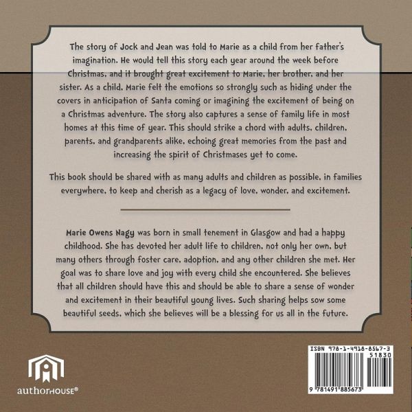 The story of Jock and Jean was told to Marie as a child from her father's imagination. He would tell this story each year around the week before Christmas, and it brought great excitement to Marie, her brother, and her sister. As a child, Marie felt the emotions so strongly such as hiding under the covers in anticipation of Santa coming or imagining the excitement of being on a Christmas adventure. The story also captures a sense of family life in most homes at this time of year. This should strike a chord with adults, children, parents, and grandparents alike, echoing great memories from the past and increasing the spirit of Christmases yet to come. This book should be shared with as many adults and children as possible, in families everywhere, to keep and cherish as a legacy of love, wonder, and excitement.