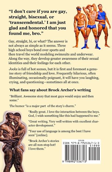 "I don't care if you are gay, straight, bisexual, or 'transcendental.' I am just glad and honored that you found me, bro." Gay, straight, bi, or what? The answer is not always as simple as it seems. Three high school boys (jocks) bond over sports and then, following in the footsteps of one's older brother, a pro football quarterback, they travel the world modeling swimsuits and underwear (including jockstraps). Along the way, they develop greater awareness of their sexual identities and their feelings for each other. Though the focus is on the three boys, the relationship between the main character and his older brother is also particularly enlightening and endearing. Jocks is full of hot scenes, but it is first and foremost a genuine story of friendship and love. Frequently hilarious, often illuminating, occasionally poignant, it will have you laughing, crying, and questioning-sometimes all at once.