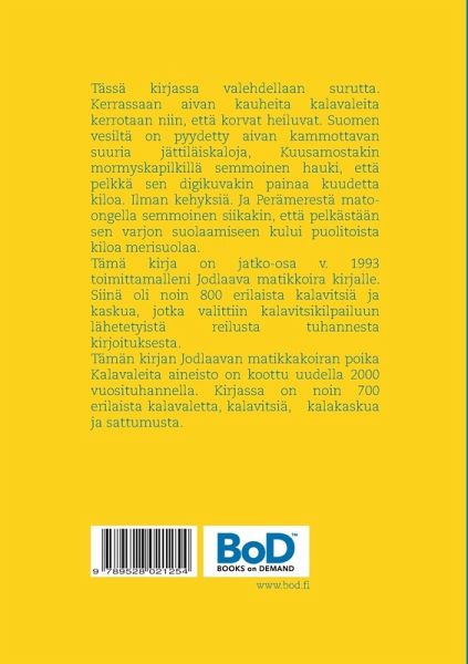 Tässä kirjassa valehdellaan surutta. Kerrassaan aivan kauheita kalavaleita kerrotaan niin, että korvat heiluvat. Suomen vesiltä on pyydetty aivan kammottavan suuria kaloja, Kuusamostakin mormyskapilkillä semmoinen hauki, että pelkkä sen digikuvakin painaa kuudetta kiloa. Ilman kehyksiä. Ja Perämerestä mato-ongella semmoinen siikakin, että pelkästään sen varjon suolaamiseen kului puolitoista kiloa merisuolaa. Tämä kirja on jatko-osa v. 1993 toimittamalleni Jodlaava matikkoira kirjalle. Siinä oli noin 800 erilaista kalavitsiä ja kaskua, jotka valittiin kalavitsikilpailuun lähetetyistä reilusta tuhannesta kirjoituksesta. Tämän kirjan Jodlaavan matikkakoiran poika Kalavaleita aineisto on koottu uudella 2000 vuosituhannella. Kirjassa on noin 700 erilaista kalavaletta, kaskua, vitsiä ja sattumusta.