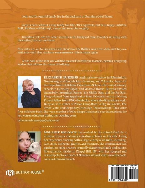 Jody and his squirrel family live in the backyard at Grandma Cole's house. Jody is born without a long bushy tail like other squirrels, but he is happy until the Bully Brothers call him ugly names and treat him roughly. Grandma Cole and the other animals in the backyard come to Jody's aid along with his mother, brother, and sister. New rules are set by Grandma Cole about how the Bullies must treat Jody and they are sent away until they can learn some manners. Life is happy again. At the back of the book you will find material for children, teachers, parents, and group leaders that address the issues of bullying.