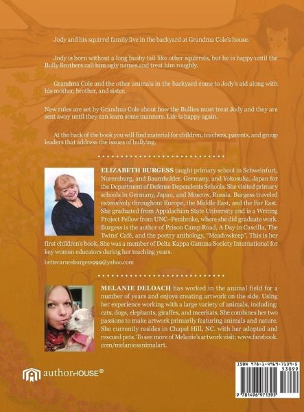 Jody and his squirrel family live in the backyard at Grandma Cole's house. Jody is born without a long bushy tail like other squirrels, but he is happy until the Bully Brothers call him ugly names and treat him roughly. Grandma Cole and the other animals in the backyard come to Jody's aid along with his mother, brother, and sister. New rules are set by Grandma Cole about how the Bullies must treat Jody and they are sent away until they can learn some manners. Life is happy again. At the back of the book you will find material for children, teachers, parents, and group leaders that address the issues of bullying.
