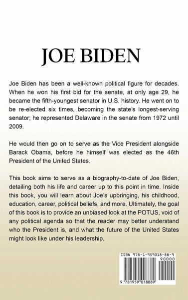 JOE BIDEN Joe Biden has been a well-known political figure for decades. When he won his first bid for the senate, at only age 29, he became the fifth-youngest senator in U.S. history. He went on to be re-elected six times, becoming the state's longest-serving senator; he represented Delaware in the senate from 1972 until 2009. He would then go on to serve as the Vice President alongside Barack Obama, before he himself was elected as the 46th President of the United States. This book aims to serve as a biography-to-date of Joe Biden, detailing both his life and career up to this point in time. Inside this book, you will learn about Joe's upbringing, his childhood, education, career, political beliefs, and more. Ultimately, the goal of this book is to provide an unbiased look at the POTUS, void of any political agenda so that the reader may better understand who the President is, and what the future of the United States might look like under his leadership.