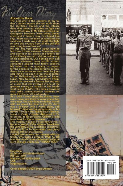 From the Introduction by Marijo Starnes The accounts in the contents of my father's diaries expose the raw truth about the sacrifices, trauma, and the intense drive that drove our soldiers to fight and to win World War II. My father realized our God-given freedoms were being threatened and in harm's way. I've heard him say: "There was a mission at hand and any sacrifices I made were all worth the fight to save this country from all the evil that was trying to overtake us." He was also very explicit about how he felt toward those enemies. Some excerpts and entries in his diaries and letters are not politically correct. I did not soften any of his descriptions. Our fighting men and women witnessed many horrific actions committed against their fellow soldiers. My father had no sympathy or respect for the enemies he considered to be heathens. I was not aware until I read his journals that he took part in four major battles in the Philippines (the battles of Papus, Luzon, New Guinea, and Southern Philippines). He received a Bronze Star and was on a ship that was involved in one of the greatest enemy air attacks in the Southwest Pacific (SWPC). His duties provided vital radio communication channels required by General Headquarters. I've sorted through hundreds of old photographs and have tried to correctly match them up with the entries mentioned. Since most of his black-and-white snapshots were not marked, there is a chance some have been mismatched. With this said, all the entries make a statement as to what the ravages of this war were all about. My parents were married on June 15, 1941. Eight months later my father enlisted and was inducted into the Army on February 24, 1942. He shipped overseas from Angel Island (California) in September of that same year. From this point on my parents would wait five long years before celebrating their wedding anniversary together. My father's letters to my mother were loving and beautiful. And my mother's return letters reflect how much she, too, loved and missed him. As a child I knew about the diaries. However, I never saw them or knew where they were kept. The only thing my father shared with me about his time in the U.S. Army was a sit-down with a world globe, and he would show me the progression of his travels from Fort Des Moines (Des Moines, Iowa) to Camp Crowder (Missouri) to Tyler (Texas) to Angel Island (California) and from there his routes overseas. This mission was quite a journey for me. I became aware of the extreme loneliness, the unhealthy living conditions, sometimes food not fit to be consumed, and going months without mail service. I would love to have one moment with my father, who passed away in 1998, to tell him how much I now understand what he went through, and to say: "THANK YOU!"