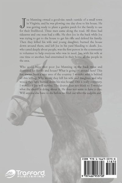 Joe Manning owned a good-size ranch outside of a small town in Virginia, and he was plowing one day close to his house. He was getting ready to plant a garden patch for the family to use for their livelihood. Three men came along the road. All three had sidearms and one man had a rifle. He shot Joe in the back while Joe was trying to get to the house to get his rifle and defend his family. Then they killed his wife and young daughter, burned the house down around them, and left Joe in his yard bleeding to death. Joe, who cared deeply about people, was the first person in the community to volunteer to help everyone who was in need. Joe, with his wife at one time or another, had entertained in their home all the people in the area. Who could have shot poor Joe Manning in the back twice and destroyed his family and house? What is going on around here? This has always been a nice area of the country. I wonder who is behind all this killing. Why would they kill his wife and daughter, and why would they have burned down his nice house? This is really a mystery. I wonder if Joe will survive. The doctor does not think so. I wonder what the sheriff is doing about it. He does not seem to have a clue. Will anyone else have to die before we find out who the culprits are?