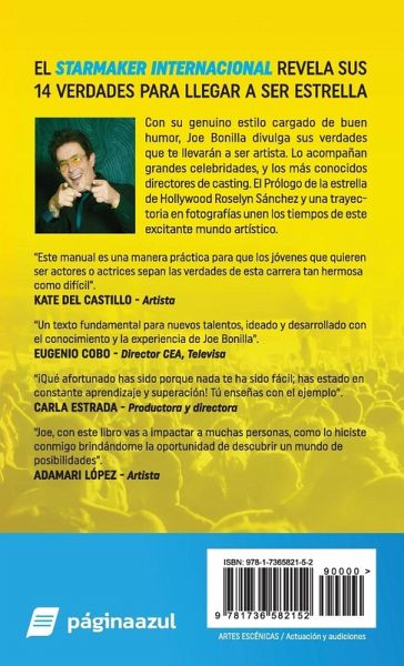 El Star Maker internacional revela sus 14 verdades para llegar a ser estrella Con su genuino estilo cargado de buen humor, Joe Bonilla divulga sus verdades que te llevarán a ser artista. Lo acompañan grandes celebridades, y los más conocidos directores de casting. El Prólogo de la estrella de Hollywood Roselyn Sánchez y una trayectoria en fotografías unen los tiempos de este excitante mundo artístico. "Este manual es una manera práctica para que los jóvenes que quieren ser actor o actriz sepan las verdades de esta carrera tan hermosa como difícil". Kate del Castillo - Artista "Un texto fundamental para nuevos talentos, ideado y desarrollado con el conocimiento y la experiencia de Joe Bonilla". Eugenio Cobo - Director CEA, Televisa "¡Qué afortunado has sido porque nada te ha sido fácil; has estado en constante aprendizaje y superación! Tú enseñas con el ejemplo". Carla Estrada - Productora y directora "Joe, con este libro vas a impactar a muchas personas, como lo hiciste conmigo brindándome la oportunidad de descubrir un mundo de posibilidades". Adamari López - Artista