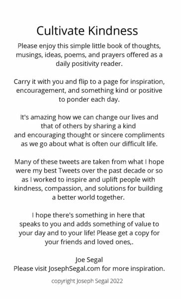 Please enjoy this simple little book of thoughts, musings, ideas, poems, and prayers offered as a daily positivity reader. Carry it with you and flip to a page for inspiration, encouragement, and something kind or positive to ponder each day. It's amazing how we can change our lives and that of others by sharing a kind and encouraging thought or sincere compliment as we go about what is often our difficult life. Many of the ideas in the pages of this book are taken from what I hope were my best Tweets over the past decade or so as I tried to create conversations around kindness, compassion, and solutions for building a better world together. Usually, they came to me in a state of flow when I was feeling loved, loved, and alive. I hope there's something in here that speaks to you and adds something of value to your day and to your life! If you enjoy it please pick up a copy for someone you care about. Tell them you bought this book for them because you care about their happiness and appreciate them. Thank you!