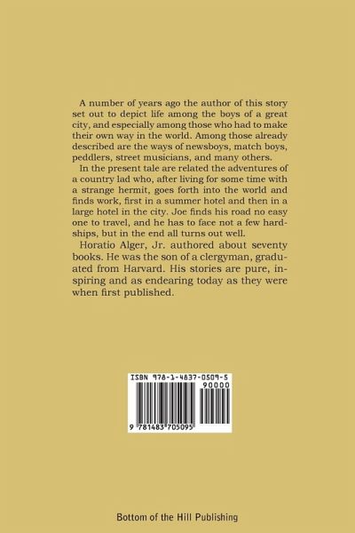 A number of years ago the author of this story set out to depict life among the boys of a great city, and especially among those who had to make their own way in the world. Among those already described are the ways of newsboys, match boys, peddlers, street musicians, and many others. In the present tale are related the adventures of a country lad who, after living for some time with a strange hermit, goes forth into the world and finds work, first in a summer hotel and then in a large hotel in the city. Joe finds his road no easy one to travel, and he has to face not a few hardships, but in the end all turns out well. Horatio Alger, Jr. authored about seventy books. He was the son of a clergyman, graduated from Harvard. His stories are pure, inspiring and as endearing today as they were when first published.