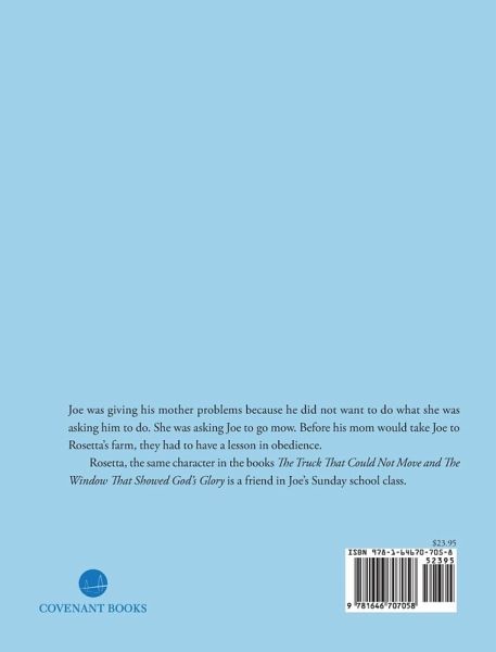 Joe was giving his mother problems because he did not want to do what she was asking him to do. She was asking Joe to go mow. Before his mom would take Joe to Rosetta's farm, they had to have a lesson in obedience. Rosetta, the same character in the books The Truck That Could Not Move and The Window That Showed God's Glory is a friend in Joe's Sunday school class.
