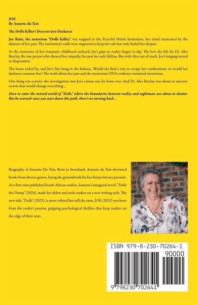 JOE By Annette du Toit The Dolls Killer's Descent into Darkness Joe Baits, the notorious "Dolls Killer," was trapped in the Peaceful Minds Institution, her mind tormented by the demons of her past. The institution's walls were supposed to keep her safe but only fueled her despair. As the memories of her traumatic childhood surfaced, Joe's grip on reality began to slip. The love she felt for Dr. Alex Barclay, the one person who showed her empathy, became her only lifeline. But with Alex out of reach, Joe's longing turned to desperation. The hours ticked by, and Joe's fate hung in the balance. Would she find a way to escape her confinement, or would her darkness consume her? The truth about her past and the mysterious DNA evidence remained mysterious. One thing was certain: the investigation into Joe's crimes was far from over. And Dr. Alex Barclay was about to uncover secrets that would change everything... Dare to enter the twisted world of "Dolls," where the boundaries between reality and nightmare are about to shatter. But be warned: once you start down this path, there's no turning back...