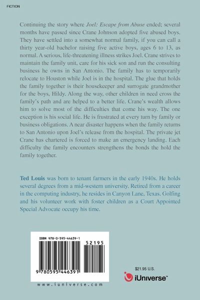 Continuing the story where Joel: Escape from Abuse ended; several months have passed since Crane Johnson adopted five abused boys. They have settled into a somewhat normal family, if you can call a thirty year-old bachelor raising five active boys, ages 6 to 13, as normal. Aserious, life-threatening illness strikes Joel. Crane strives to maintain the family unit, care for his sick son and run the consulting business he owns in San Antonio. The family has to temporarily relocate to Houston while Joel is in the hospital. The glue that holds the family together is their housekeeper and surrogate grandmother for the boys, Hildy. Along the way, other children in need cross the family's path and are helped to a better life. Crane's wealth allows him to solve most of the difficulties that come his way. The one exception is his social life. He is frustrated at every turn by family or business obligations. A near disaster happens when the family returns to San Antonio upon Joel's release from the hospital. The private jet Crane has chartered is forced to make an emergency landing. Each difficulty the family encounters strengthens the bonds the hold the family together.