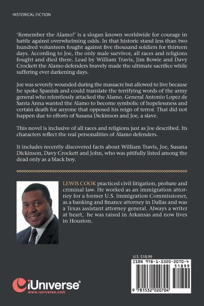 Remember the Alamo! is a slogan known worldwide for courage in battle against overwhelming odds. In that historic stand less than two hundred volunteers fought against five thousand soldiers for thirteen days. According to Joe, the only male survivor, all races and religions fought and died there. Lead by William Travis, Jim Bowie and Davy Crockett the Alamo defenders bravely made the ultimate sacrifice while suffering ever darkening days. Joe was severely wounded during the massacre but allowed to live because he spoke Spanish and could translate the terrifying words of the army general who relentlessly attacked the Alamo. General Antonio Lopez de Santa Anna wanted the Alamo to become symbolic of hopelessness and certain death for anyone that opposed his reign of terror. That did not happen due to efforts of Susana Dickinson and Joe, a slave. This novel is inclusive of all races and religions just as Joe described. Its characters reflect the real personalities of Alamo defenders. It includes recently discovered facts about William Travis, Joe, Susana Dickinson, Davy Crockett and John, who was pitifully listed among the dead only as a black boy.