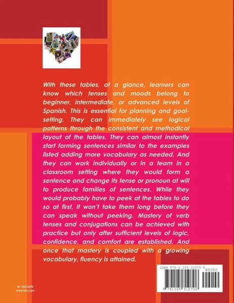 With these tables, at a glance, learners can know which tenses and moods belong to beginner, intermediate, or advanced levels of Spanish. This is essential for planning and goal-setting. They can immediately see logical patterns through the consistent and methodical layout of the tables. They can almost instantly start forming sentences similar to the examples listed adding more vocabulary as needed. And they can work individually or in a team in a classroom setting where they would form a sentence and change its tense or pronoun at will to produce families of sentences. While they would probably have to peek at the tables to do so at first, it won't take them long before they can speak without peeking. Mastery of verb tenses and conjugations can be achieved with practice but only after sufficient levels of logic, confidence, and comfort are established. And once that mastery is coupled with a growing vocabulary, fluency is attained.