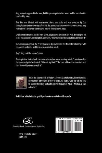 Joey was not supposed to be born, but his parents put God in control and he turned out to be a healthy baby. The child was blessed with remarkable talents and skills, and was protected by God throughout the many journeys of his life. But even under the most dire circumstances, Joey resisted God's presence, waiting until he was 60 to discover Jesus. Once joined with Jesus and the Holy Spirit, Joey became a modern day Paul, devoting his life to the expansion of God's kingdom. Joey says, "You have to live the story to be able to tell it." Join Joey's journey from the 1940s to present day, experience his strained relationships with his parents and sister, and the repercussions that result. Joey's Story could be anyone's story. The inspiration for this book came when the author was attending church. "I was tapped on the shoulder by God and asked, "Where Is My Book?" The Lord told me how to write it and that He would get me through it." This is the second book by Robert J. Tropea Sr. of Charlotte, North Carolina. He has more adventures of Joey to come. He states, "God did tell me how to present the story and did help me through it. When I finished, it was cathartic."