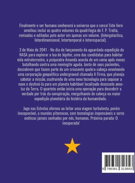 Finalmente o ser humano conhecerá o universo que o cerca! Este livro omnibus inclui os quatro volumes da quadrilogia de F. P. Trotta, revisadas e editadas pelo autor em apenas um volume. (Intergalactica, Interdimensional, Intertemporal e Interespacial). 3 de Maio de 2041 - No dia de lançamento da aguardada expedição da NASA para explorar a lua de Júpiter, uma das candidatas para habitar vida extraterrestre, a psiquiatra Amanda acorda de um coma após meses batalhando contra uma meningite aguda. Junto de seus pacientes, descobrem que fazem parte de um crescente quebra-cabeça envolvendo uma corporação geopolítica underground chamada A Firma, que planeja sabotar a missão, usufruindo de uma nova tecnologia para saquear a nave e destiná-la para um planeta habitável localizado dezessete anos-luz da Terra. O quarteto então inicia uma operação para descobrir a verdade por trás da conspiração, mergulhando de cabeça na maior expedição planetária da história da humanidade. Jogo nas Estrelas oferece ao leitor uma viagem turbulenta, porém inesquecível, a mundos pitorescos, com tecnologias impensáveis e seres exóticos jamais sonhados por nós, humanos. Próxima parada: O inesperado!