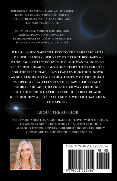 Drugged, operated on, and abused since birth, Lia Dean's people are forced to rid themselves of all emotion and self-serving thought. Johan people, void of emotion and morals, prove to be capable of extraordinary evil. Can a world like this not only survive, but thrive? When Lia becomes witness to the barbaric acts of her leaders, her very existence becomes a problem. Protected by those she was taught to see as her enemies, emotions start to break free for the first time. Lia's leaders hunt her down as she begins to fall for an enemy of the Johan people. As Lia attempts to escape her tyrant world, she must navigate her way through emotions she's never experienced before and keep her new allies safe from a world that kills for sport.