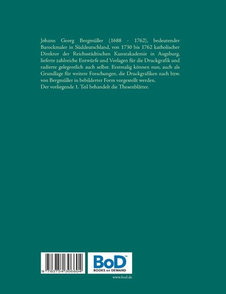 Johann Georg Bergmüller (1688 - 1762), bedeutender Barockmaler in Süddeutschland, von 1730 bis 1762 katholischer Direktor der Reichsstädtischen Kunstakademie in Augsburg, lieferte zahlreiche Entwürfe und Vorlagen für die Druckgrafik und radierte gelegentlich auch selbst. Erstmalig können nun, auch als Grundlage für weitere Forschungen, die Druckgrafiken nach bzw. von Bergmüller in bebilderter Form vorgestellt werden. Der vorliegende 1. Teil behandelt die Thesenblätter.