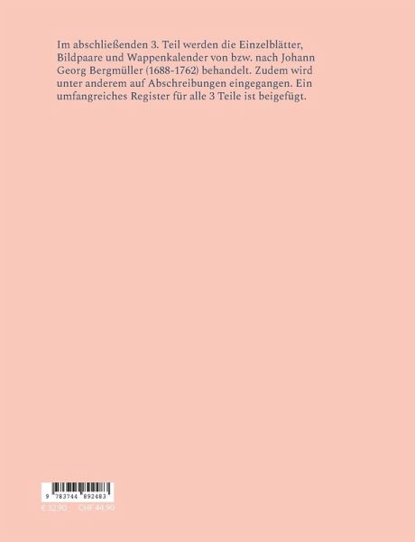 Im abschließenden 3. Teil werden die Einzelblätter, Bildpaare und Wappenkalender von bzw. nach Johann Georg Bergmüller (1688-1762). behandelt. Zudem wird unter anderem auf Abschreibungen eingegangen. Ein umfangreiches Register für alle 3 Teile ist beigefügt.