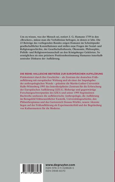 Um zu wissen, was der Mensch sei, notiert J. G. Hamann 1759 in den "Brocken", müsse man die Verhältnisse befragen, in denen er lebe. Die 24 Beiträge des vorliegenden Bandes zeigen Hamann im Schnittpunkt gesellschaftlicher Konstellationen und stellen neue Fragen der Sozial- und Religionsgeschichte, der Gesellschaftstheorie, Ökonomie, Philosophie, Politik- und Religionswissenschaft an den Königsberger Gelehrten. So ermöglichen sie eine präzisere Positionsbestimmung Hamanns innerhalb zentraler Diskurse der Aufklärung.