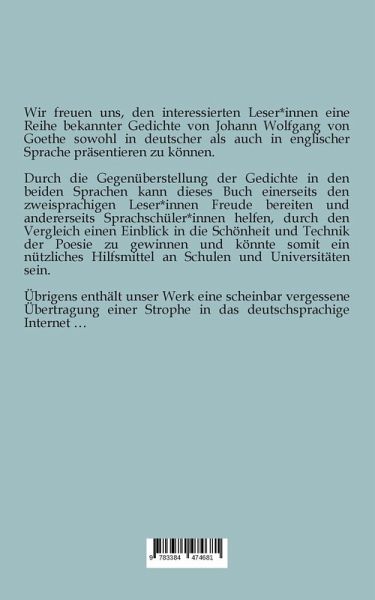 We are happy to present to the interested reader a number of well-known poems and one passage out of »Faust« by Johann Wolfgang von Goethe in both the German and the English language. We think that publishing Goethe's poems in two languages can be interesting for bilingual readers, but it may also help language students to gain an insight into the beauty and techniques of poetry by comparing both versions. So this book could be a useful tool at schools and universities. You will find in this book a poem with a stanza which seems to have been forgotten, when you look it up on the Internet.